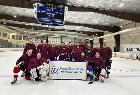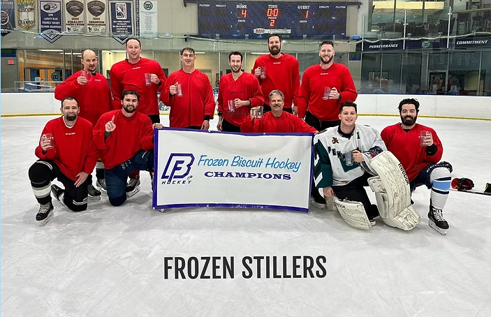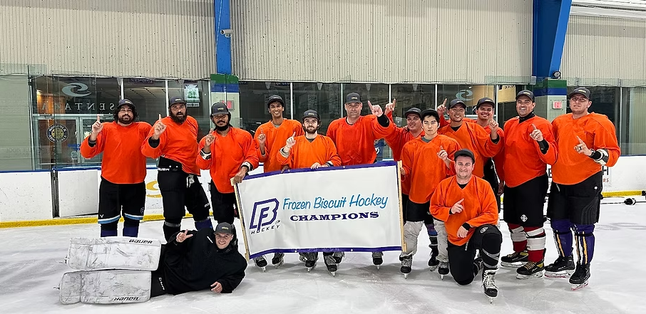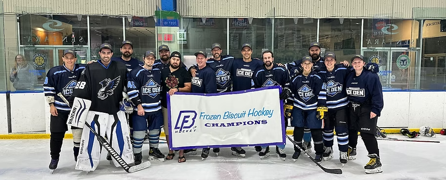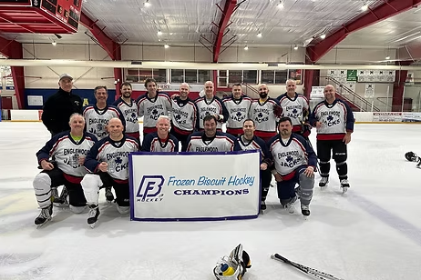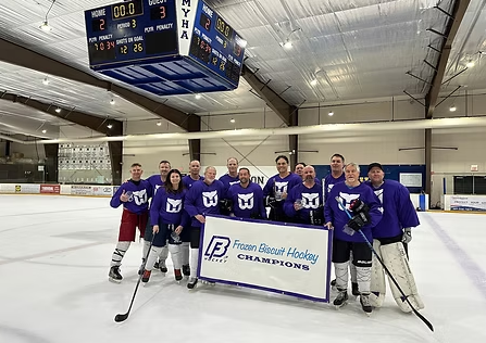 A perfect 65 deg sunny day was filled with both off and on-ice activity on Sept 18 at the Chilled Ponds Yorktown Rink. Teams starting early afternoon competing in corn hole, sharp shooter, and distance shooting competitions. Their off-ice points carried over indoors as they starting competing in non-stop on-ice 3on3 action. Ice Holes, Old Puckers, Slappy Seconds, RTB, and Pucktards competed for Tiering placement in the playoffs. Some close games and overtimes resulted in the newest Frozen Biscuit Champions as follows: